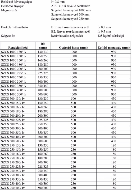 A magas minőségű savállóacélból gyártott, kettősfalú szigeteltcsövek 1000, 500, valamint 250 mm hosszban készülnek. A belsőcső 0,8 mm falvastagságú, alapanyaga 1.4571 minőségű saválló lemez, a külső burkolat 0,5 mm falvastagságú és alapanyaga 1.4301 minőségű rozsdamentes lemez, matt és fényes felülettel.